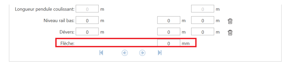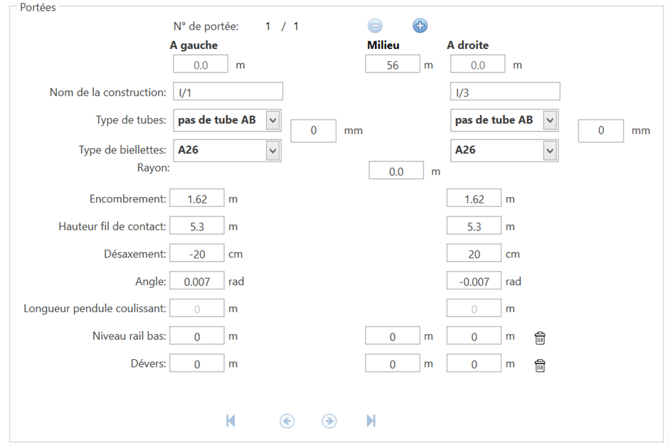 Champ Signification Nom de la construction : Le nom de la construction à gauche et à droite de la portée. Si vous travaillez avec un fichier .pen, un nom est automatiquement renseigné. Vous pouvez toutefois le modifier à votre convenance. Type de tubes : Le type de tubes (s'il y en a un) utilisé dans le bras fixé à la caténaire. Si c'est un type de bras spécial (relèvement, ancrage,...) c'est ici qu'il est selectionné. Type de biellettes : Le type de biellette utilisé dans le bras fixé à la caténaire. Rayon : Le rayon moyen de la portée Encombrement : La hauteur entre le fil de contact et le câble porteur. Hauteur fil de contact : La hauteur à laquelle le fil de contact est suspendu. Désaxement : Le désaxement pour le poteau de droite Avertissement : Si vous modifiez le désaxement, il convient également de recalculer les angles.Angle : L'angle de la caténaire par rapport à la verticale sur la construction. Important : Il s'agit ici de l'angle à gauche et à droite de la portée, non pas à gauche et à droite du poteau. Vous devez donc saisir deux nouveaux angles pour chaque portée.Longueur pendule coulissant : En fonction du système choisi, vous pouvez renseigner ou non ces champs de données. Remarque : Pour une caténaire compound, la valeur par défaut est de 0,2 m.Niveau rail bas : Le niveau du rail le plus bas au droit du poteau gauche et du poteau droit de la portée. La valeur Milieu est calculée automatiquement. Dévers : La différence de hauteur entre les voies dans une courbe ou un virage. La valeur Milieu est calculée automatiquement. -
