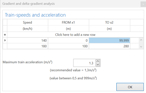 Rood: Limiet van de helling van de bovenleiding om de snelheden uit het vorige scherm te respecteren.