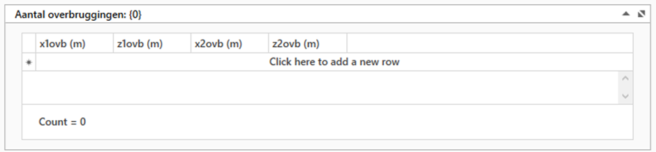 Veld Betekenis x1ovb (m) x-waarde van het begin van de brug ten opzichte van het begin van de spanlengte (xstart) z1ovb (m) z-waarde van de onderkant van het begin van de brug Belangrijk: Het gaat hier niet om de vrije hoogte.x2ovb (m) x-waarde van het einde van de brug Opmerking: Hou rekening met de xstart-waarde.z2ovb (m) z-waarde van het einde van de brug -