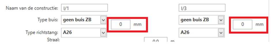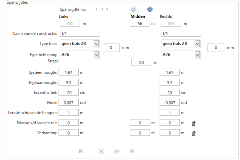 Veld Betekenis Naam van de constructie: De naam van de constructie links en rechts van de spanwijdte. Als je werkt met een pen-fiche, wordt er een automatisch een naam ingevuld. Je kan die echter aanpassen naar keuze. Type buizen: Het type buis zijwaartse bevestiging (indien aanwijzig) die gebruikt wordt. Als het om een speciaal type arm gaat (opheffing, verankering, …) moet u dat hier selecteren. Type richtstang : Het type richtstang dat aan de bovenleiding bevestigd wordt. Straal: De gemiddelde straal in het midden van de spanwijdte Systeemhoogte: De hoogte tussen de rijdraad en de draagkabel Rijdraadhoogte: De hoogte waarop de rijdraad hangt Excentriciteit: De excentriciteit voor de rechterpaal Waarschuwing: Als je de excentriciteit aanpast, moeten ook de hoeken opnieuw berekend worden.Hoek: De hoek van de bovenleiding ten opzichte van de loodlijn op de constructie Belangrijk: Het gaat hier om de hoek links en rechts van de spanwijdte, niet links en rechts van de paal. Voor elke spanwijdte moet je dus twee nieuwe hoeken ingeven.Lengte schuivende hangers: Afhankelijk van het gekozen systeem kan je deze velden al dan niet invullen. Opmerking: Bij een compound bovenleiding is de standaardwaarde 0.2m.Niveau v/d laagste rail: Het niveau van de laagste rail aan de linkse en rechtse paal van de spanwijdte. De waarde voor Midden wordt automatisch berekend. Verkanting: Het hoogteverschil tussen de sporen in een bocht of boog. De waarde voor Midden wordt automatisch berekend. -